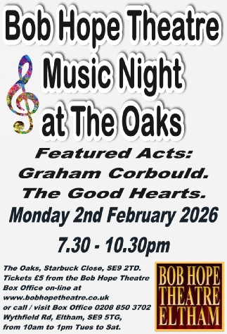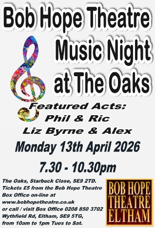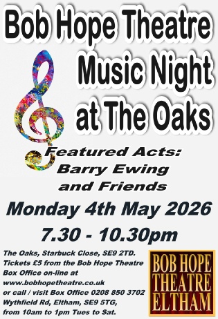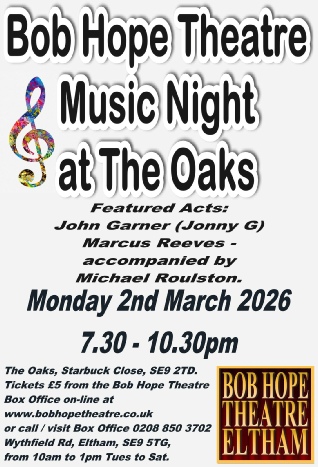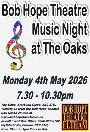 THE BOB HOPE THEATRE'S MONDAY MUSIC NIGHTS ARE CURRENTLY BEING HELD AT AN EXTERNAL VENUE - THE OAKS, STARBUCK CLOSE, ELTHAM SE9 2TD.